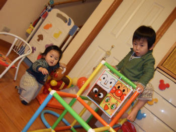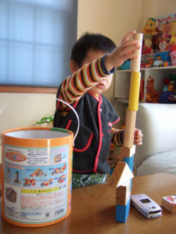今週は保育園にまったく行けていないヒィ君。おうちにこもっている彼は、毎日たいくつ~そんな彼は毎日おもちゃをひっくり返して、遊んでいます。で も 。ひっくり返すだけじゃなく・・・最近はこんなに積み木を積めるようになりました前から積んではいたんだけど、コツをつかんだのか、だんだん高く積める様になってます。すごいな~、ヒィ君でも、でも・・・・・・ユズちゃんに、積み木を投げつけて喜んでいるようじゃ、まだまだだけどね
