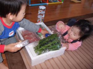 保育園から帰ってきたヒィ君。ママが夕ごはんの支度をしていると・・・自分のおもちゃ箱からおもちゃのまな板とサクサク切れるおもちゃのお魚をキッチンへ持ってきました。『あ~(ママの真似だ!よく見てるんだな~) ママと同じだね~。 でもさ、包丁ないと、切れないよ』と、言うと・・・リビングに戻って、持ってきました、おもちゃの包丁教えたわけでもないのに、よく見て聞いているんだな~と、感心ですしばらくキッチンで遊んでいたヒィ君ですが、リビングのTVから好きな音楽が流れてきたため、踊るべくリビングへ戻って行きました。さ て 。ママはお魚を焼こうとグリルを開くと・・・! ! !犯人は、あの男の子しかいません。一体いつの間に入れたのか・・・ママ、びっくりですそんな今夜のごはんは↓で~すおばぁちゃんからカキアゲをいただいたので、テーブルがにぎやかになりました(写ってないけど、ヒィ君の大好きな野菜サラダとお味噌汁もちゃんとあるぞ)
