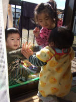 最近ユズちゃんが上半身起こしの滞空時間が延びたせいか、ヒィ兄ちゃんもユズちゃん=遊べる相手と認識しつつあり・・・ユズちゃんもヒィ君がそばに来ると嬉しそうたまに、二人で遊んで(!?)いますヒィ兄ちゃんはまだ赤ちゃん語専門なので、ユズちゃんと会話が成り立っているようです今日はとってもいい天気兄ちゃんは土曜日にある運動会の予行練習日なので、晴れてヨカッタ朝、保育園に着いてすぐに予行練習だったので、ママとユズちゃんはちょっと見てきました隠れて見ていたら最初ヒィ君に見つかって、ヒィ君が駆け寄ってきてしまった最初の全体の体操はまったくせず、地面の石をいじって遊んでいるニィちゃんかけっこでは、アンパンマンのマーチが流れていたので、待機中踊っていたり前の組の子達と一緒に走ってしまったり、フライングしたり・・・自分の番では、ボーっとしていて全然走り出さず結構笑っちゃいましたまぁ、2歳3ヶ月だから、そんなもんです。本番の日も、晴れるといいなぁ