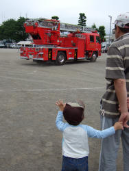 日曜日の朝、おばぁちゃんから今日は市の防災訓練が小学校の校庭であって、たくさんの消防車が集まっているからヒィ君・ユズちゃん、いらっしゃ~いとのコトでした。まだパジャマの兄妹を急いで着替えさせ、家族揃ってレッツゴーこの市に越してきて(パパはずっと住んでいますが)6年。初めて来て見ましたが…かなり賑やかで人もたくさん!!消防車や救急車、自衛隊の車もた~くさんで、こりゃヒィ君よろこぶわ~と思いました。もちろん、大喜びのアニキですなんと!ヘリまで出動すっごいまじかに飛んできて…ママも大興奮!!ヒィ君も初めてヘリコプターをこんなに近くで見て大喜びでしたヒィ君の頭の上を旋回していったしね!!!炊き出し訓練のボランティアで先に行っていたおばぁちゃんと、自衛隊の車で炊いたご飯のおにぎり&汁物をパクリ普段見ることのできないヘリでの救助活動や消防車などの救助活動も見る事が出来たしカンパンや飲み物も貰えて(防災用に家に常備しておくように)とても充実した参加となりました。避難生活への備えって、本当に大切なんだな…と、改めて考えさせられもしました。来年も、出来れば参加!です家に帰ってからは、頂いたスイカをこれまた美味しくいただきました今年初物!すっごく甘くて美味しかったですユズちゃんも『もっと~!もっと私にスイカを~!!』と、美味しく食べていましたアニキも、おかわりをパパの分から貰っていました…ご馳走さまでした