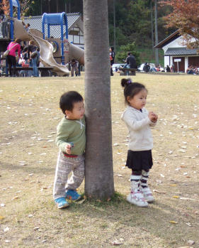 先月末より母実家に遊びに来ている、母&ヒィ&ユズ今日は「道の駅・川場」ってところに、イトコのココちゃんとバァバと遊びに来ました。そこで、ちょっと可愛いショットが見られたのでUPですう~ん、「小さな恋の物語」ってカンジで、中々可愛いでしょ?でも実際はこの二人・・・「ダルマさんがころんだ!」をしていた、よその男の子の真似をしているだけなのですわが息子のおバカ全開ショットもおまけにUP