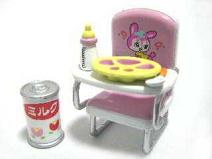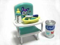 メガハウス ベビーコレクション 1.お食事セットA なんとなく昭和の香りがするこのシリーズ。イスのうさぎの絵がたまりません。お皿を拡大するとこうなっているのですが、3つある大きい穴はおかずやご飯用だと思うけど、2つある小さい丸い穴は何を入れる所だろう?スプーンとかフォークとかさす所?違うよね?