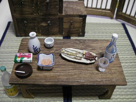 みんなが早くに寝ちゃったので今夜は一人で晩酌です。リーメント ぷち呑みシリーズより(畳やタンス、ちゃぶ台は100円ショップにて購入)塩辛とめざしとゲソ。なかなかいいチョイスですね。ちょっと寂しげですが