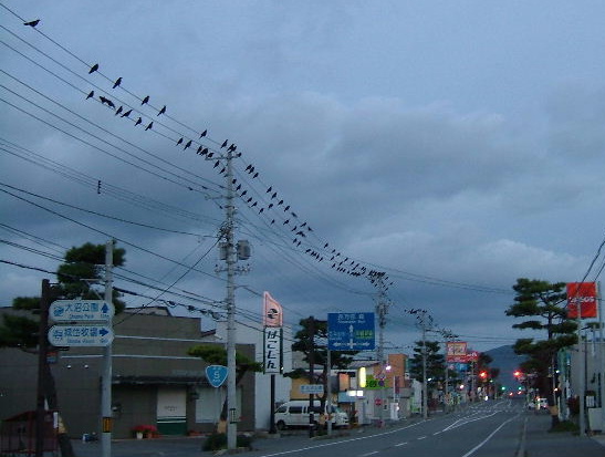 冬将軍の斥侯隊が来る24日、日の出まえに電線に留まっているカラスの群れに じじ様ビックリ! 前方に赤信号があります。その左側の電線にもカラスがびっしり、でも向かい側 の電線には、一羽もいないんですよね~ふしぎ! 信号左折の・・・・・電線音頭!!?からすです。