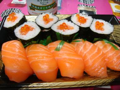 私はいつも名古屋駅から家まで飲み屋街を歩いて帰ります。先日も楽しく歩いていると、前から白人の若い男性と父親らしき男性が歩いてきました外人さんだ~と思ってみたら、若い男性が話しかけてきたのです 『まぁ、英会話の勉強の成果が現れるときがきたわ!!』と思ったら、↑ (夢にも思っていませんが・・・)『すみません、焼肉はどこですか?』と日本語で聞かれました焼肉????といってもいろんなお店があるしな~と思って、『お店の名前、わかる?』と聞いたら、手に○しるしをつけた地図を持っていたのでそれを見せてもらいました。ほんとにすぐ近くのお店だったので、『こっちこっち、ここですよ~』とお店の前まで案内しました(若い男性には親切な私) せっかくだから、『何人(なにじん)ですか?』と聞いたら、ちょっと意味が分からなかったみたいでしばらく考えてから、『フランス人です』と答えてくれました。よく考えたら『なにじん』ってセンスない聞き方よねフランスから、なんで名古屋なんかにきてるのかしら??それにしても、日本語で聞かれてよかった英語で聞かれたら、ビビッて逃げ出すところですわ・・・ このあいだ、おすしが食べたくって、久しぶりに高島屋の地下で購入しました。 サーモンのおすし、大好きなのです。698円が200円引きとお得でした。 株主様用ビールと一緒にねでも普通のスーパードライのほうがおいしい気がしました。 おやつには松坂屋で買った森幸四郎のどらやき。一度おみやげにもらって、すごくおいしかったのです。期間限定で駅前の松坂屋で売っているみたいです