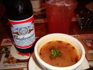 かなり前ですが、だんなさんのお誕生日にアウトバックステーキハウスに行ってきました。お誕生日にはステーキ無料のクーポンがもらえるのですよ~今回はめずらしく、セットにしたのでスープ付私は飲まないのですがだんなさんは大好きだから喜んで飲んでました。 食べ放題のパンこれが熱々ですっごくおいしいのです。 ステーキとえびのから揚げ、そして野菜のセット。えびがすごく大きくておいしかった~。 パスタ。ステーキ入りでピリ辛風味。これがまた外国のみたいにボリューム満点、味もよくって最高 このお店、アルバイトの子がみんなかわいくて明るくてすごく楽しいの~。次は私のお誕生日に行く予定です