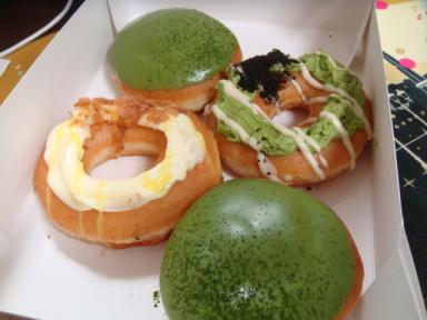 けっこう前ですが久しぶりに買いに行きました。いつもあまり並びたくないので箱入りのセットを買ってます。この日も夏限定のセットを買おうと箱買いの列に並んだら『すみません、売り切れました』と言われたので単品の列に並びなおして購入。10人ちょっとしか並んでいなかったので5分ちょっとで買えました。 この抹茶のが買いたかったのですよ~。ちなみにこの日、両方の列であげたてドーナッツをもらったので無料で2個もらっちゃいましたおにたろうさんのお話によると今はもう無料のドーナッツは配っていなんですってね。最近、名古屋ではクリスピーもハリエもモンシュシュもあんまり人並んでないけど、みんなどこに並んでいるのでしょう??