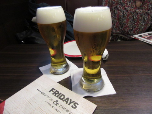 仕事がカレンダー通りの私、明日は仕事。先日、一緒に東萬に行った元同期が東京に帰るというので見送りという名目でTGIフライデーズでランチ。夏のように暑いのでビールをいただきますでもまぁ、寒くても飲みますオニオンリングのハーフ。シーフードパスタ。そして今月がお誕生日の同期、お祝いでこんなデザートももらえました。このお店、外国人も多くて雰囲気もいいのですが栄のアウトバックの方がいろんな面でいいなぁ。ただ近いのでこっちに行ってしまいます。この後、新幹線の改札まで見送り。今度は夏に会いましょう