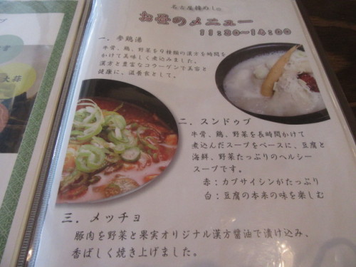 昨年秋にできた韓国料理のお店。開店当時はとてもすいていて、やっていけるのかなぁって思っていたのですが最近、ランチタイムにはものすごい行列。中を見るとサインが書かれた色紙が何枚かあったのできっとテレビに出たんだろうなぁ。イルチュールというお店です。テレビに出る前のことですがランチに行ってきました。ランチタイムのお料理は3種類。参鶏湯にしてみました。食べるの何年ぶりかなぁ。いろんなおかずがついてきてどれもとってもおいしい。半身です。ちょっとだけもち米も入ってますがそれとは別にごはんもついてきます。すっごくおいしくってこの日は寒かったので温まりました。でも韓国では体力をつけるため、暑い夏に食べるんですって鰻みたいな感じなんでしょうね。他のも食べてみたいけど最近ほんとに混んでいるかならなぁ。落ち着いたら行ってこよう
