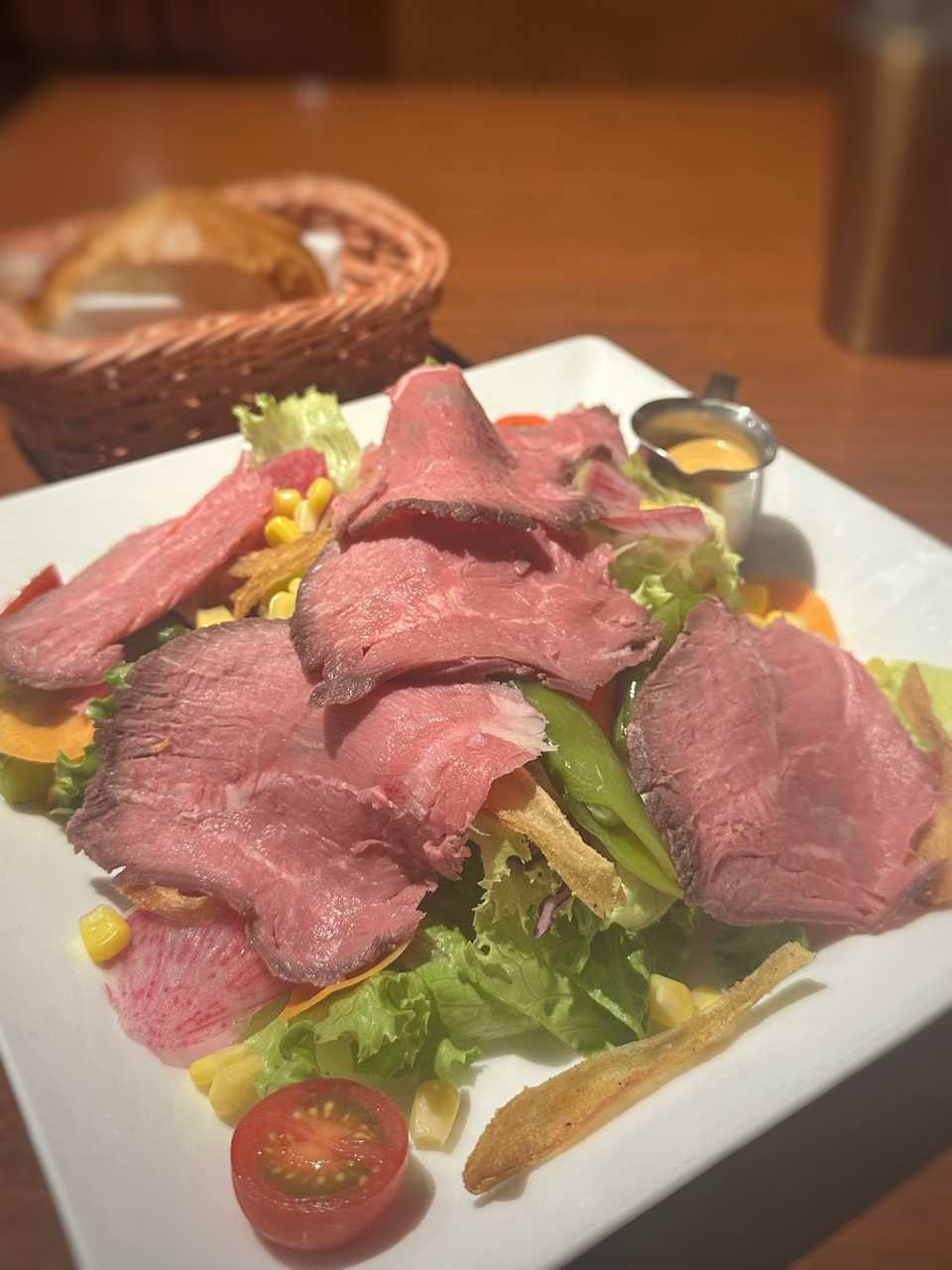 サクッとサラダが食べたくて駆け込んだのは東京駅の外れグランスタ八重洲に入っているチーズとワインのお店?なのか?ランチはリーズナブルな価格帯でパスタやサラダがいただけ …しかも12時までの入店だと100円引きありがたいお店でございますこの日はサラダ気分だったのでローストビーフサラダ(1100円)もちろん?100円引きの時間帯に入店サラダはフワフワのバケット2カットと一緒にほどなく運ばれてきますドレッシングは別添えなのがうれしいサウザンアイランドっぽい色合いですがピリッと辛みのあるコブサラダっぽいドレッシングでしたローストビーフをいったん避けて野菜に回しかけますサラダはレタス、スナップエンドウ、コーンニンジン、紅心大根、プチトマトが確認できますもう少し色味と種類があると良いんだけどねキリっと冷えた野菜は新鮮で美味ローストビーフはカットはうすいですが(ほんとに薄いのよ…)しっとりとしていて臭みもなくこれも標準以上のものじゃないかな?途中、ドレッシングが足りなくなりそうでしたがサクッといただくサラダランチとしては思った以上の満足感があってこの後蒸し暑い夏の間 お世話になりそうだわACORN グランスタ八重洲店(エイコーン) MAP東京都千代田区丸の内1-9-1 グランスタ八重洲 B1F☆★ブログランキングに参加しています★☆一日一回ポチッと応援クリックよろしくお願いしますにほんブログ村こちらもよろしくねメッセージはこちらからお願いします