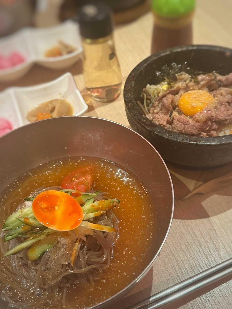 そろそろ「冷やし中華始めました~」が始まっておりますな…確かに蒸し暑い… でも冷やし中華じゃなく冷麺食べたい!って気分で韓国屋さん単品の冷麺は6種類?くらいあるのだけれど熱々石焼ビビンバも食べたくなって両方食べられちゃう韓流セットC(1490円)冷麺はそば粉の韓国冷麺か小麦粉の盛岡冷麺どちらも選べるのだけれど、ここは韓国で!ご飯ものもいろいろ石焼ビビンバありますが肉!ってことでプルコギビビンバドリンク付きですが+300円で生中に変えられるのここはもう飲むしかないっ! ←変な意気込み ミニミニ…マイクロだななミニサラダと小鉢2品ビールを飲みつつ待ちます~同時に運ばれてくる冷麺とビビンバ 冷麺のスープはほんのり甘みがあるみたい…なのでお酢をドバっとかけて冷たいスープがおいしくなりますそば粉のせいなの?黒っぽい麺はお決まりのコシのあるゴムのような麺これがおいしいのよ… これを求めていたのよ…そして石焼ビビンバはコチジャンをかけて熱いうちに鍋肌にご飯をくっつけちゃいましょうこのお焦げがすばらしくおいしいのです…ご飯少な目コールを忘れていたのでご飯の量もたっぷり(これでハーフとは…)でもおいしくてたまらない熱々をフーフーしながらカリっカリのお焦げ香ばしい!ピリ辛お肉と野菜ものっけてぱくつくことしばし… 汗が出てくるのも忘れてお焦げを食べ、その後キンキンに冷えた冷麺のスープを飲むと… シュ〇テ〇トが必要な人になりそでもこの熱冷熱冷熱冷を繰り返します!ダブル炭水化物にプチ罪悪感を持ちつつ完食してしまった …午後眠くなるのは必至ね吾照里 東京駅八重洲地下街店(オジョリ) MAP東京都中央区八重洲2-1 八重洲地下街南1☆★ブログランキングに参加しています★☆一日一回ポチッと応援クリックよろしくお願いしますにほんブログ村こちらもよろしくねメッセージはこちらからお願いします