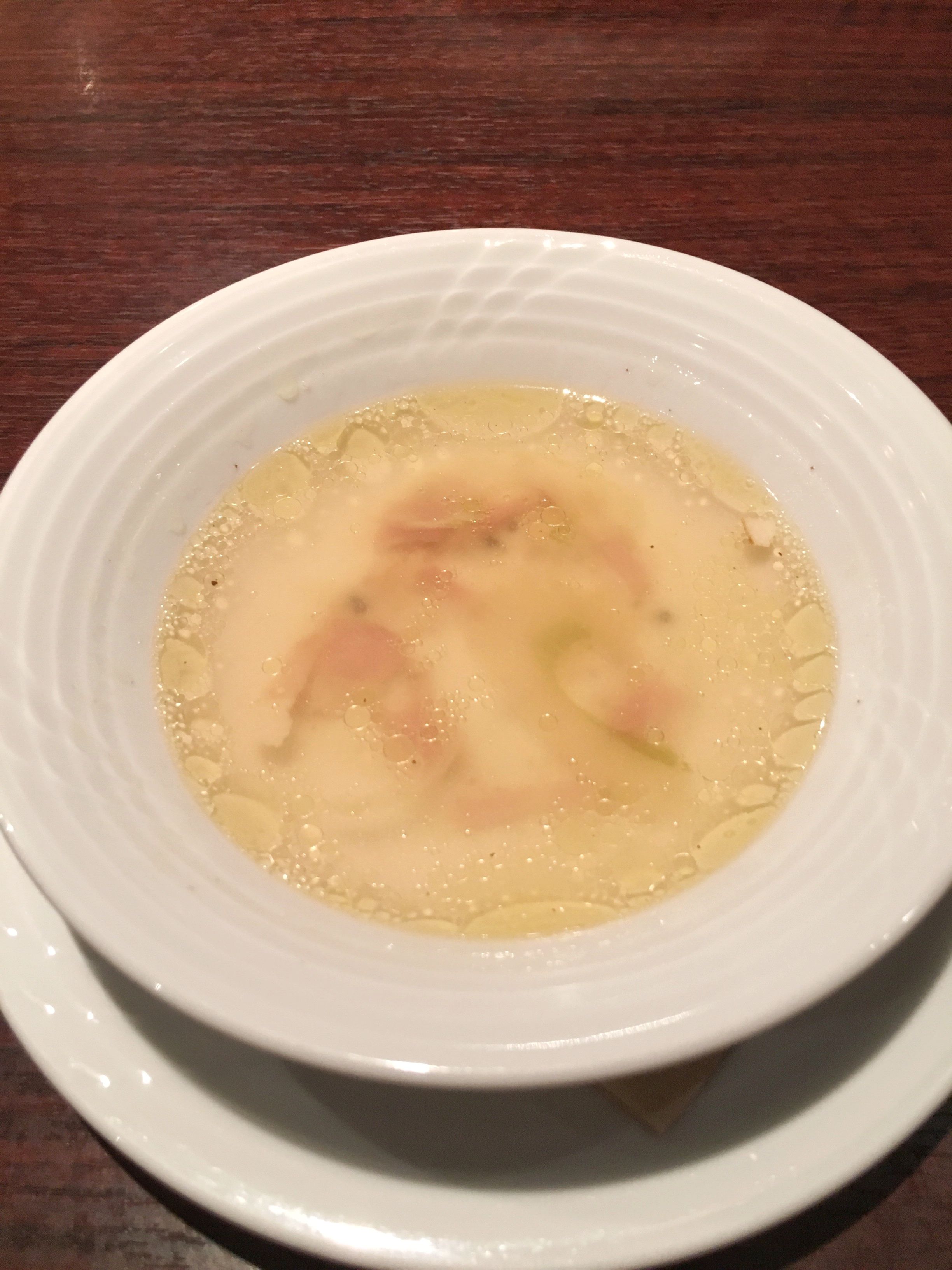 スープはデフォでベーコン・玉ねぎ・セロリのコンソメでしたが