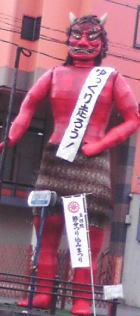 節分3週間前くらいから、岐阜玉性院近くの歩道に出現する赤鬼。高さ10メートルほどもあるのです。信号待ちの際、思わず激写2月3日の節分には、つり込み祭りといってこの赤鬼さん、もみくちゃにされながら本堂へ担ぎ込まれるのです
