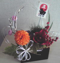 こちらは、会社のイベントのフラワーアレンジ教室で作ったもの。すべて造花なので扱いやすかったです。お正月のものはやっぱり、前もって準備できるこういった造花のものが多いですね