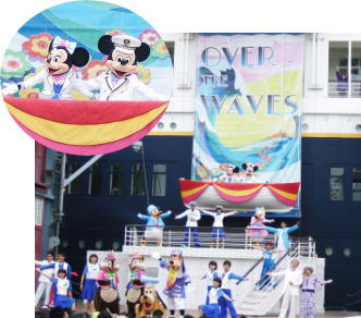 キャラクターグリーティングのあとは、アメリカンウォーターフロントのドックサイドステージで行われるミュージカルショー「オーバー・ザ・ウェイブ」を観に行きましたちょうど、始まる時間に着いたので、立ち見でしたが立って観る人も少なく、よく見えました小さな子どもでも充分楽しめるとてもにぎやかなショーでした
