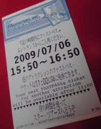 7月6日(月)、翌日はディズニーランドへ。アーリーエントリーのチケットがあったのですが、そんなに急ぐつもりもなかったので、エントランスに着いたのは8時50分。すると、「アーリーエントリーの入場は一旦ストップ。9時まで待ってください。」とのこと。知らなかった・・・。あと数分早かったら、入れたのに。9時は一般の入場と重なります。入口は違うので、すぐに入れますが・・・。入場と同時にみんなのパスポートを集めて、モンスターズインクのファストパスに向かって猛ダッシュ大勢の人が一斉に走っているその様子は、まるで、その年の年男めざして境内を走る神社の行事のよう私も負けじと走って、ほとんど並ばずにファストパスをGETその後、あっという間にながーい列が・・・。ちょっとのことで、随分違いますよかったあ・・・モンスターズインクのファストパスは、アトラクションの向かい側、プラザ・レストラン側です