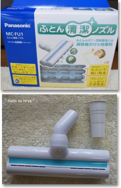 ふとん用の掃除機ノズル、「Panasonic パナソニック ふとん清潔ノズル」をJoshin web 家電とPCの大型専門店さんで購入しました。各メーカー共用つぎ手パイプ付きでしたが、私はパナソニックの掃除機を使っているので、掃除機に付属のつぎ手でOKでした。裏はこんな感じです。↓↓↓抗菌W回転ローラーでたたいて吸い取り、かき出しブラシでホコリ・ダニをしっかりかき取る!と、書いてあります。 また、ふとんの他にも、ぬいぐるみ、ソファー、洋服、カーテン、座布団、車のシートなどにも使えるそうです。今までは掃除機に付属の小さいヘッドを使っていたので、こちらを購入してふとんの掃除機がけがラクになりました。花粉の季節には特に活躍しそうです 【7/24am9:59迄ポイント3倍】【Joshinは平成20/22年度製品安全対策優良企業 連続受賞・プライバシーマーク取得企業】MC-FU1【税込】 パナソニック ふとん清潔ノズル Panasonic [MCFU1]【返品種別A】【送料無料】