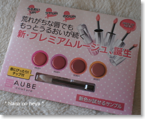 オーブのプレミアムルージュのサンプルをいただきました。どの色も、使いやすそうな色です。専用のチップもついていました。乾燥しやすいこの季節にぴったりでとても潤って、つるんとした唇になれました☆