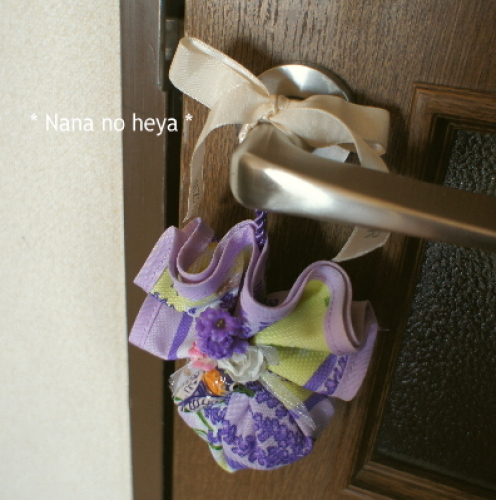 フランス土産でいただいたポプリ。リボンを通してドアノブにつけてみました。ポプリは揉むとよく香ります