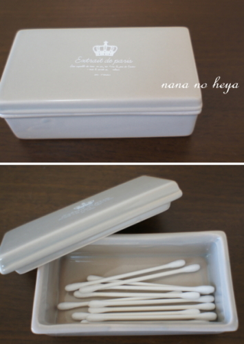 100円ショップ、セリアで購入した陶器の入れ物です。綿棒を入れるのにちょうど良いサイズでした☆