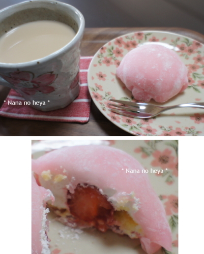 おやつに「雪苺娘」。切り口がきたなくなってしまいましたが、雪苺娘はクリームとスポンジケーキ、いちごを求肥で包んだスイーツです。和と洋のミックスですね。苺大福に洋菓子のテイストが加わった感じ?説明しにくいですが、おいしくいただきました