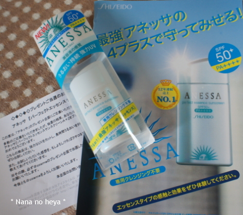@コスメのプレゼント企画で、アネッサ「パーフェクトエッセンスサンスクリーンA+」が当たりました。こちらは2月21日発売の新商品。何が違うかというと、このアネッサ、PA++++なのです。PA++++は、肌の老化に影響があるといわれているUV-A防御効果が極めて高いのだとか。今の時期はまだ少し早いかな・・・と、思うので、春の日差しが気になる頃から使ってみようと思います