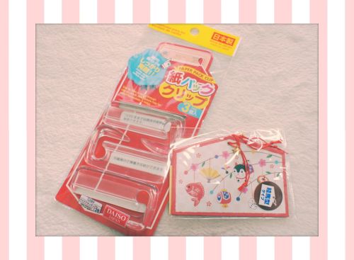 先日、100円ショップ、ダイソーで購入したもの。紙パッククリップとお年玉の袋。お年玉の袋は絵馬の形になっていて小さな鈴もついています。3枚入り。紙パッククリップは、下の写真のように開封した牛乳などの紙パックをしっかりととめることができます。 にほんブログ村