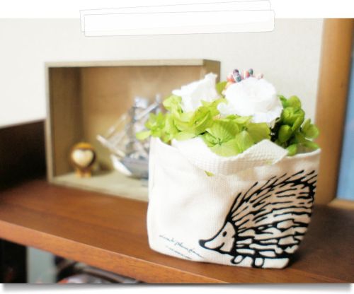 リンネル12月号のリサ・ラーソン、ハリネズミ柄親子トートの小さい方にプリザーブドフラワーのミニアレンジを入れてみました。高さがちょうどよかったので・・・☆ にほんブログ村