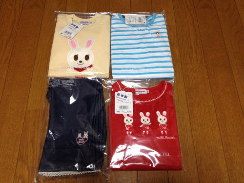 先日あかちゃんぱあくさんで購入した、ミキハウスのサマーパック我が家にも到着しました~購入したのは100CMです早速ネタバレします~*リーナちゃんTシャツ・・・10500円*リーナちゃんデニムパンツ・・・7875円*リーナちゃんタンクトップ・・・3780円*ルーシーTシャツ・・・5775円総額27900円でした。ルーシーちゃんとうとう我が家にもやってきてしまいました~まだ、ルーシーちゃんのお洋服あったんですね・・・ミキハウスが好きな方ならあまり好まないであろうデザイン・・・(お好きな方がいましたら本当にすみません・・・)でも、よく見ると日本製だし、バクプリのルーシーちゃんは意外とかわいいんですよね~その他はすべてリーナちゃん特にリーナちゃんのTシャツは定価が1万円もするので、これだけで充分もとがとれそうです。気づいてみれば、ルーシーちゃん以外は全部リーナちゃん。私はリーナちゃん大好きなのでうれしいのですが、これがお姉ちゃんの福袋だったらな~と思ってしまいました。下の子にはもう少しうさこがいてくれたら、うれしかったです。でも、リーナちゃんのタンクトップも裾がふりふりでかわいいし、デニムパンツも今年から履かせられそうだし、何より手持ちのものとひとつもかぶらなかったので、内容としては満足ですこれだけ、リーナちゃんが多いと、お姉ちゃんの120CMも欲しくなってきてしまいますが、そううまくいくでしょうかルーシーちゃんが入ってくる可能性もありそうですよね。皆さんのネタバレを参考にして色々考えたいと思います