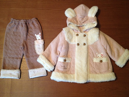 いよいよ、明日20日の14:00~キムラタン楽天市場店さんで、クーラクールの冬物の販売が始まりますねムージョンジョンの福袋のネタバレもまだしていないのに、最近キムラタンの話題ばかりですみません・・・クーラの冬物、オンラインでの販売がこんなに早いとは思っていなくて、今日慌ててベビープラザにリーフレットをもらいにいってきましたそしたら・・・すでにお店では冬物販売してました~いや、実はお店では販売しているかな~と少し期待もしていたのですが・・・で、実物を見たら最後。やっぱり買ってきてしまいました。*サークルキルトうさみみコート(95センチ)・・・4095円*サークルキルト長丈パンツ(90センチ)・・・1995円昨年、アウターを買い逃してしまったので、今年こそは買うぞと決めていました。今年はアウターが3種類でているようですね。どれもかわいかったのですが、やっぱりうさみみのキルトコートに一番ひかれてしまいましたピンクもイエローもどちらも可愛くて、ほんと~に悩んだのですが、一緒に購入したブラウンのキルトパンツによく合っていたピンクを買うことにしました。キルト生地とくるみボタンがとってもかわいいです。ボタンはこんな感じのスナップボタンが3か所ついていました。長丈パンツも去年大活躍だったのでデザインは少し違いますが、サイズアップでの購入です。家に帰ってから早速着せてみました身長88センチ、体重11.5キロの娘が95センチを着ています。袖を1回折った状態で、ぴったりでした。これから購入される方の参考になればうれしいです。さすがにまだ半袖を着ている時期なので、コートを買うには周りの目が気になってしまいましたが、店員さん曰く「このコートはきっと人気だと思うので早めに買った方がいいと思いますよ~」とのことだったので、ついつい買ってしまいました。恐らく主人に見つかったら「バカか~」と半沢直樹の福山さんバリに言われそうなので(梨々花さん真似してしまいましたごめんなさい~)、しばらくは隠しておこうと思います。店員さんに聞いたところ、今回クーラの冬物は2段階に分けて入荷されるとのことで、他に欲しかったコールテンチュニックや裾フリルプルオーバーなどはまだ入荷されていませんでした。お店での販売は25日頃になるそうです。今回は実物を見る前にオンラインでの販売開始になってしまうので、どうしようか悩むところですが、私はおそらくオンラインでの購入は諦めて、店舗で購入することになりそうです。あと、リーフレットにはなかったのですが、モデルさんが履いているムートンブーツが気になっています。この靴の販売はあるのでしょうかもしあるんだったら買いたいと思っていますが、今のところ不明です。
