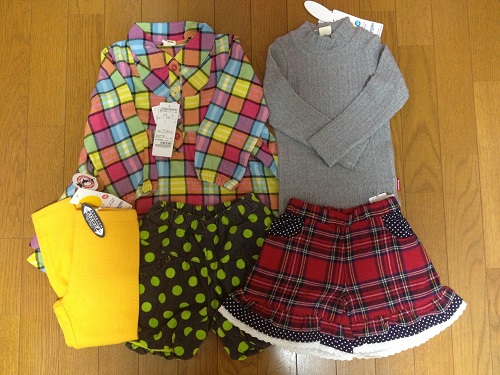 先日こどもの森 e-shopさんで購入した、ムージョンジョンの秋冬福袋届きましたので、早速ネタバレさせてください購入したのは女の子の100センチです。届いたのは以下の5点です見事にカラフルですまずはトップス・・・ワンピースは4095円。グレーのハイネックは日本製で2415円です。一番カラフルなこのワンピース。私は何気にこれが一番気に入りました写真では分かりづらいですが、ボタンもカラフルでかわいいです。ただ、私にはルービックキューブ柄に見えてしまいますが・・・あと、グレーのハイネックはシンプルですが、何にでも着まわせる万能選手ですワンピースの中に着てもいいかな~と思いました。あと3点はボトムスでした。まずはこのキュロットスカート・・・これもかわいいです。お値段2730円。今年このようなチェックのスカートが欲しかったのでよかったです。あと次はこれ~蛍光緑のドットのパンツ・・・目がちかちかしますよく見ると、ポケットのところに小さいボンボンがついていてデザインはかわいいのですが、色が・・・うまく着こなせるか心配です。トップスにシンプルなトレーナーとかを持ってきたら大丈夫かな・・・ちなみにお値段は3045円でした。あとは、黄色のスパッツ、1995円。これもカラフルです。どう着こなそうかしら・・・と、こんな感じで私にとっては3勝2敗の内容でした合計は、14280円でした。でも着れないものはないので、内容的にはよかったのかもしれません。早速今年の秋から着せるぞと思っていたのですが、今回購入した100センチ、どれも大きくて来年用になってしまいそうですムージョンジョンの夏物は100センチでもぴったりだったのですが、やっぱり冬物は大きいですね~グレーのハイネックは着せられそうですが、ワンピースは確実に来年用になりそうです。これは、ミッキー キッズ 楽天市場店さんのこの福袋。95センチに参戦するべきか。しばらく悩もうと思います。