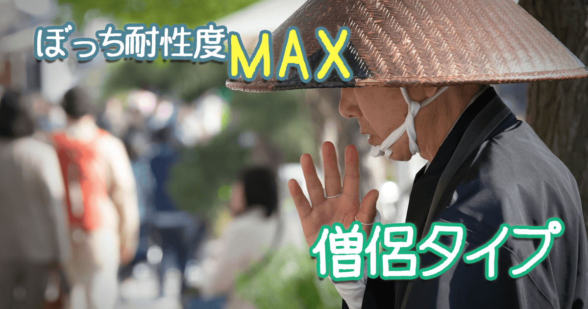 あなたはぼっち耐性度MAXの「外界との交流を捨てた僧侶タイプ」です。一人その道を極めしあなたは、すでにぼっちを悟っています。「正しき行いをする善人ほど孤独になる」という言葉がのように、あなたは決して間違っているわけではありません。しかし、時には人と関わることも重要です。交流を完全には捨てず、関わりを持てる機会が来た時には流れにのりましょう。