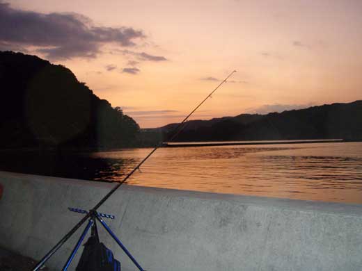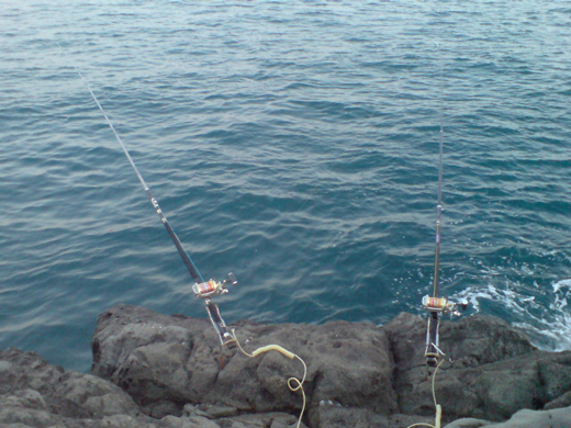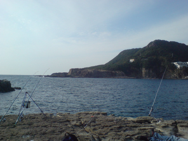 2日に前回のうっぷんを晴らしに、再釣行(o o)/HGである、南紀の某地磯へ高ちゃんと(数年ブランクがあり、最近カンバックした一番弟子)レッツら ゴー(^^)/てな訳で、昼飯しを食べたあと(**)波止場より、釣り人がいてはるか?確認すると、二匹もいらっしゃるではないですか(T T;ひと山、手前の帰りが究極の地磯と悩んだ末・・・写真の地磯に、決定!! 途中まで歩いて先をみると、先方は帰りはったではないですか (^^夜釣りをしはるか聞く手間が省け、嬉しくて余計に忍者走りに...誰が抜く訳でもないのに・・・到着して直ぐに、準備にかかったものの日没まで3時間もありまんがな~~~~(T T;そして日没!!戦闘開始(><)/ エサは、イカの切り身&中エビおらは、投げ二本&フカセ一本。高ちゃんは、投げ一本&フカセ一本。ん.....9時半までは、うーちゃん&あーちゃんの総攻撃!仕掛けの交換に、高ちゃん撃沈(;+)...フカセも投げも、中エビに変更...コロに絞るらしい。おらは、タマミの弩級狙いの為、変更せずイカの切り身で第二戦闘開始高ちゃんのフカセの電気ウキが、ベン.ジョンソンよりも速く消しこんだ(@@;;締め込みはあるが、しれとる!上がって来たのはなんと、良型のグレ様ではありませんか(><???35センチはある、口太!! こんな太い仕掛けに、オマケに中エビ前回のこともあり、オミアゲ!きーぷっ!(自信がないので)少し腹が減ったので、おにぎりを食べながら座って話したら...高ちゃんのフカセの竿が、がらがらがラーーー(二人とも、ウキを見てませんでした)あわてて竿を立てる高ちゃん、締め込みがそこそこ!!!30秒後に上がって来たのは、コロダイ51センチ(^^@6年ぶりに上げたとあって、大喜びの高ちゃん!師匠も、うれぴー(^o^)/~その後もおらには、うーちゃん&あーちゃんのオンパレード(==;;うーちゃんの当たりと間違うくらいのチビタマGET`S(。。?少し眠気に誘われ、しばし楽園へ.....「来た~!!」の高ちゃんの雄たけびに跳び起き、高ちゃんの竿は三号の為ぶり上げれないので、あたふたと網を探す。またもや、コロダイ52センチ 高ちゃんdayですな(-。-)y-.O0その後、ど干潮の2時に納竿(><;おらは、うーちゃんに、撃沈二連敗となった....ちなみに、最後の竿を巻くと重たくて(。。;;最後まで、うーちゃんやと思いきや!ギリギリで、ぼちゃんと落ちた。ラッキーと思ったのもつかの間、なっなんと???モンスター級のイセエビの足だけが、針に・・・・(T T;とことん撃沈ですな(・ ・)/~ 完敗どすっ!!