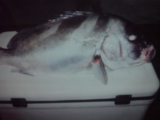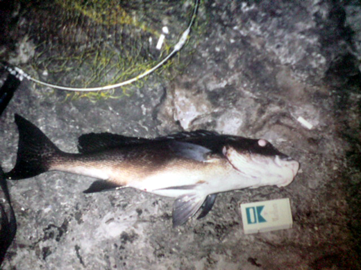 2011.8.14-15今回も、ニック警部さんに誘って頂き ( ^^)HYBCの、ニック警部さん、まっさん、ボーさん、ミントモさん、水ナスのそ~さんの6人で、破壊島をいわしに行ってきまつた。(> <)/今回も前回と同じく、そ~さんとペアで挑みますた。熱帯低気圧のせいで、風は12メートル波は2.5メートルのウネリで、普通の釣りではありまてん (TдT)風上の対面の磯には、ニック警部とまっさんが、見えていてそっち側に、釣りたい気分ですたが・・・12メートルの風が・・・(+ +;よって追い風になるように、楽園島向きに釣り開始!!こちら向きの海は、ウネリと風が調和したのか後ろ向きとは違い穏やか (^^)しかし逆に穏やか過ぎて・・・ウツボしか・・・(;==)時折、後ろチームの声がして海を照らしたり・・・(ー ー; 気になるな~夜中12時に下げ8分で、潮も動かないので2時まで休息 (--)zzzそ~さんは・・・倍は寝とるな・・・目が覚めたのは、2時半!やばっ!! 寝過ごした (TдT)急いでイカ短付け、仕掛け投入!!!5分もしない内に、ウツボのアタリが・・・・・怒涛のアタリがきて、宮川大輔のアカーン!!!と叫び、そ~さんを笑かす想定なのに・・・・・このままでは・・・ヤバイ (~へ~;とにかく追い風に乗せ、力の限り弩遠投しないとな!弩遠投が功を奏したのか、竿が発射~(@▼@)ヨッシャ~! 待ちわびたど~!!!底々の引きだが、有り余る力で即効に浮かせた (・・)磯際に立ち魚を確かめたいが・・・8メートル程下の岩影で・・・見えんがな~そ~さ~ん!!!数回呼ぶが・・・寝とるし~ (:=д=)やっと起きて・・・魚を確かめて貰うと・・・・・えっ!コロちゃうか~エェ~! (;=д=)(-д-;)吉本新喜劇のように、息ピッタリに顔を見合して言うたのには・・・笑ろた3時丁度に上がってきたのは・・・紛れもなくコロダイなのだが・・・何か違う・・・・・(;--) 良くみたら・・・・・(@ @; オレンジの水玉でなく・・・白黒・・・(;--)コショウダイ???・・・嫌っ!帯がないし・・・魚種討論と撮影などに時間を取られ、急いで2人は戦闘開始!!また、ズドーン!!!と飛んだのは・・・オラの竿 (@@;うりゃ~っと、渾身の力でアワセたら・・・・・すかっ! (;==)針がかりしなかった (T T; クソ~!その後30分はまた・・・ウツボっちのお相手そろそろ片付けようかと、思った矢先・・・ズドーン!!(;@д@)超ゴリ巻きで上がって来たのは (@▼@)本命のタマミ 54cm5月以来やの~(T▼T)そ~さんからの祝福を受けつつ撮影&絞めてた矢先・・・ズドーン!(;@@)・・・もう片方の竿が・・・・・(T▼T)/音速ゴリ巻きで上がって来たのは・・・本命 タマミ 49cm まだ時合いや~!!!っと、意気込みとはうらはらに渡船の時間が迫る。そ~さんもウツボ&仕掛け全負けで、1本納竿の片づけ開始。時刻は4時半、心の中であと1回来て~!と願った途端!ズドーン!!!マジか~!!(T▼T)/喜んで合わした瞬間・・・グワ~~ン (;@@)アカーン!!!と脳裏に浮かぶも、のされる訳にはいかん!が・・・フルパワーで締め込みを耐えるも・・・2歩引きずられ7秒程の間、両手で耐える。少し締め込みが緩んだ瞬間に、剛力招来!!!渾身の力で巻く!浮いた所をそ~さんに確認してもらったら・・・オォォ~!!70は、あるで~!!!がっちり掛かっとるから、ぶっこ抜くで~!目の前には・・・(;@@)デカタマが・・・計ると・・・77cm 以上(;@@)残念ながらデジカメが・・・テンバってしまい、そ~さんに頼んだが・・・そ~さんのもテンバって・・・携帯で撮ったが・・・暗いので・・・あとで撮りました(T T)少し縮んだようですが・・・ま~良しです。 えっ!2日目?・・・(= =;ウツボ地獄と、根掛かり地獄と、爆風と、蚊地獄で・・・やる気30%で撃沈・・・どす!(笑)