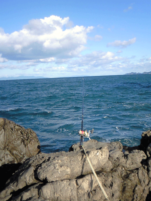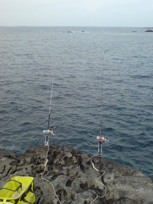 エピソード 1 の続きです! m(_)m内向きは、ウツボ山盛りとアカハタ?のみ29.7センチ・・・・・現地で計れば良かった! (T T;これぼんがデカタマを上げたキッカケで、最初のポイントに移動!!波のしぶきは、下げ潮でマシに・・・・・滑るけど (- -;セットし直してる矢先、またもこれぼんの雄叫びが・・・・・「師匠~!来ました~!どうしましょ!!」魚の大きさも見えたので、「ぶり上げろ!!」と指示!45センチぐらいのタマGET!!「今日は、これぼん日和やの~~~」と言い、釣り座に戻る。雰囲気は、最高!!ヤツは、まだおる!!! 第3戦闘開始!!三脚の後ろが段差で危ないので、その後ろで竿を見守る。ピトンの穴がないので、すこしドラグを緩めてた竿が飛ぶ!!「ジャ~~~ジ~~ジ~~ガラガラ~~」 (@ @:急いで竿を取る!!が、段差の下なので,手と膝を使いよつんばいで・・・・・あと数センチの差で、なんとか竿を握れた!!マンガ見たいなシーンで・・・「よっしゃ~~~!こんかい~~!!」(@▽@;やっと剛力招来!!煙が出るくらい・・・・・音速ゴリ巻き!!!手前のシモリに入るも・・・・・なんのその・・・手こずったが(T T;1分後、上がってきたのは、これぼんより少し小さいような・・・デカタマ(@ @;感動しまくり、我に帰ると・・・・・タモが・・・・・ないやんけ~~~!!!ぶっ ぶりるしかない・・・・・・・(= =;竿が柔いので、道糸を持ち・・・・・・慎重に・・・・・祈りながら・・・・・そ~~っと・・・テンションをかけると・・・・・「ぷんっ!!」・・・・・「ぷんっ!!」って・・・・なんや~~~~っ!!(;T дT)/目を疑った!!デカタマが手を振って、お帰りなる・・・・・姿が・・・・・せめて、お写真を~~~!!「うそやろ~!!まじで~~!!」この言葉を、どれだけ繰り返したことか・・・・・しかしこんなもんでは、破壊島は許してくれまへんどした