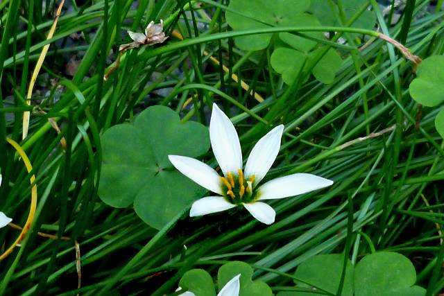 タマスダレ(玉簾、珠簾) 学名:Zephyranthes candida 英名:white rain lily, autumn zephyrlily 別名:タマツヅリ 分類:ベンケイソウ科ベンケイソウ属