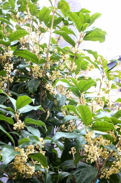 ギンモクセイ(銀木犀) 学名:Osmanthus fragrans var. fragrans 英名:fragrant olive 別名:銀桂、モクセイ 分類:モクセイ科モクセイ属
