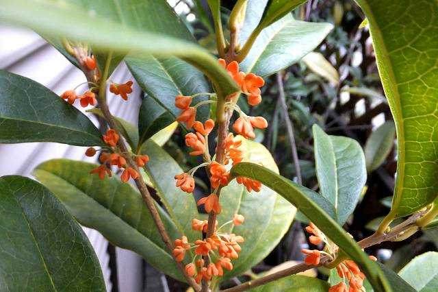 ノウトウキンモクセイ(濃橙金木犀) 学名:Osmanthus fragrans var. aurantiacus 別名:紅花キンモクセイ、フレグランスレッド 分類:モクセイ科モクセイ属のキンモクセイ(ギンモクセイ)の変種