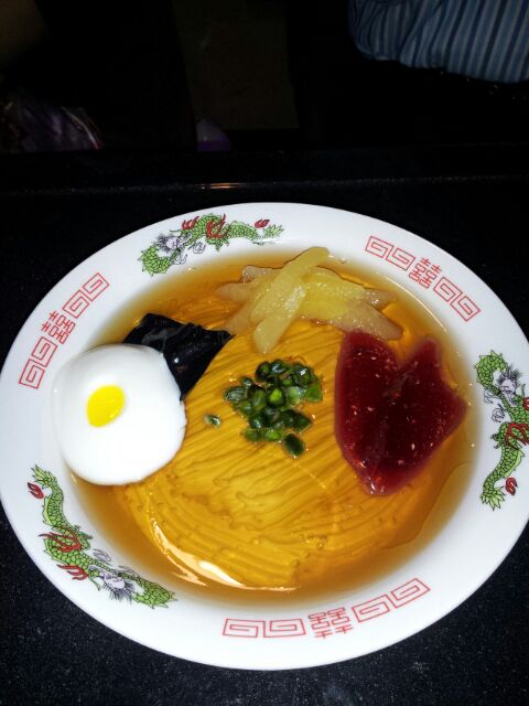 ラーメン… 実はこれ、ケーキなの。 紅茶ゼリーの下には モンブランのクリーム チョコチップ入りのスポンジケーキ。 高崎市『手作りお菓子 まちのくまさん』 ざるそばや茶碗蒸しも有るらしい。