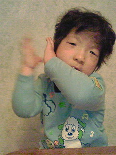 拍手をするときはまず、左手の甲を右耳にピタリとつけ、右手をパチパチ当てて鳴らします。こちらは私がとりあえず普通に拍手していれば満足のようで、真似をしろとは言われません。「おかあさんといっしょ」の古い録画のワンシーンだと推測するのですが定かではありません。