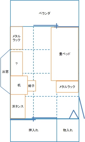 →関連記事:今回の小改造リフォーム畳ベッドの発注が片付いたので、2階洋室の書斎化に着手する。購入する畳ベッドの置き場所は、出窓と反対側の6畳の長辺しかない。今、暫定的にそこに洋ダンスを置いているため、それも移動する必要がある。それ以外に置くものとしては、パソコンを置くPCデスク&OAチェア。今はないので、買ってくる必要がある。使っておらず、解体してあったスチールラック2個も、もったいないから、できれば活用したい。それらのレイアウトを検討した結果、図のような配置となった。洋タンスは、悩んだ末、押入れの横に設置。こうすると押入れの奥の方の出し入れが大変不便になってしまうが、畳ベッドが置ける優先すると、タンスはこの場所に置くしか手がない。押入れの奥には、めったに出し入れしない布団、毛布、座布団類のストックなどを固めて入れることにして、不便だが割り切ることにした。布団などが古くなったときに取り出す程度なら、押入れの手前側の荷物をいったん取り除いて、引っ張り出すような形で、取り出すことは可能だから、これで我慢しよう。タンスが、少し出窓のカーテンレールにも被るため、カーテンレールも少し位置を修正して、タンスに当たらないように変更し、カーテン止めの位置を出窓内側に変更。一方、出窓の右側には、使い道がなく解体されていたスチールラックを組み立て直して、置くことにする。ここには、私の趣味の道具やパーツ類を置き、また、一番下の段は、奥さんの要望に応え、ベランダで洗濯物を干すときに使うグッズが置けるようにした。洋ダンスと、スチールラックの間には、出窓があり、既にリビングから移動した32インチテレビが置かれている。パソコンデスクを置くなら、この前しか場所がないのだが、テレビの邪魔にならないように置く必要がある。さてどうしようか?まずは、手ごろなPCデスク探しから始めよう。一方、畳ベッドの脇にもう一つのスチールラックが置けそうだ。ただ、ここはPCデスクからは離れてしまうため、配線上は不利なので、何に使えば、有効に活用できるか、もうちょっと考えてみよう。にほんブログ村