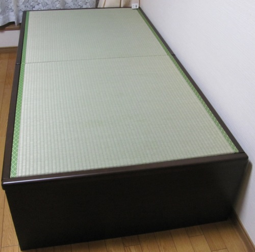 →関連記事:リフォーム(3)-2 畳ベッドの購入注文していた畳ベッドが届いた。3個口で、結構箱はでかい。なので、届き次第直ちに私が運べるように、土曜に配送をお願いしてあった。2個の箱は、一辺が1m近くあり、30kgと重量もあったため、一人で持つのは無理で、奥さんと、以前紹介した「キャリーラクダ」を使って、何とか階段から2階に持ち上げることができた。女性の一人暮らしだと、設置は頼んだ方がいいかもしれない。ただ、目的の部屋に運べさえすれば、その後の組み立て自体は簡単で、ドライバ1本あればよく、10分程度で完成する。むしろ、本体をダンボール箱から傷つけずに取り出す方が、時間が掛かったぐらいだ。それも合わせても、組立て時間は1人で30分といったところだ。なお、2つの箱を連結するためにボルトとナットを使用するのだが、1個のナットが加工不良で、どのボルトをねじ込んでも途中で止まってしまう。仕方ないので、メールで現物の写真を添付して、事情を説明して交換をお願いしたところ、すぐにメール便で新しいナットを送ってくれた。ただ、そのおかげで、結果的に、畳ベッドに寝るのは、来週末まで延期となった。完成品は、こんな感じだ。やや角の処理など雑なところもあるが、アウトレット品だからといって、目立つような傷やアクリル塗装の塗りむらは特に見当たらなかった。畳のにおいや柔らかい感触も、悪くない。畳部分は、取り外せて、天日干ししたり、古くなったら交換もできるのもいいな(交換用の畳も買える)。床は、それほど力を入れなくてもスッと上がり、布団を収納したりするには十分な大きさ。ただ、通気口は大きいとは言えないので、カビ防止を考えると、除湿剤を入れておいた方がいい気がした。あとは、落下防止柵をどうするかだ。跳ね上げ式の開閉で収納が楽々♪ 荷物の出し入れが簡単になりました。【送料無料】跳ね上げ式畳ベッド[ヘッドレスタイプ]【い草畳表】シングルサイズ【日本製】【マラソン2011冬_生活】【マラソン20112】特選アウトレットがお買い得跳ね上げ 収納ベッド 畳ベッド楽天ランクイン 工場アウトレット特価 【送料無料】凄い大量収納 跳ね上げ式畳ベッドヘッドレスタイプ シングルたたみベッド タタミベッド【after0608】特選アウトレットがお買い得! 跳ね上げ 収納ベッド 畳ベッド楽天ランクイン 工場アウトレット特価 【送料無料】大量収納付き 跳ね上げ式畳ベッドパネルタイプ シングル収納付き たたみベッド タタミベッド【after0608】特選アウトレットがお買い得! リフトアップ 跳ね上げ畳ベッド 畳 収納付き工場アウトレット特価 【送料無料】大量収納 跳ね上げ式 畳ベッドシングルロング ブラウン色ヘッド部はお好みで選ぶ大量収納ベッド たたみ タタミベッド【after0608】大容量!跳ね上げ式収納付き!送料無料!い草畳ベッド ヘッドレス 木製 国産 日本製 大量収納ベッド シングルサイズ【送料無料】ヘッドレス大収納備長炭入り畳ベッド シングルサイズい草 日本製・国産跳ね上げ式収納付き 大量収納ベッド ベット 木製 %OFF セール SALE 送料込み)【新規開店120112】【新規開店120510】特選アウトレットがお買い得! 畳ベッド 跳ね上げ 収納付き楽天ランクイン 工場アウトレット特価 【送料無料】跳ね上げ式畳ベッドヘッドレスタイプ セミダブル 大量収納付き収納付き たたみベッド タタミベッド【after0608】にほんブログ村