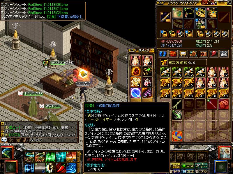 どうも~ 今回も懲りずにRS日記です。 今回はこちらに挑戦してみました。金の増幅ですね。金の増幅はずっと代行でやってもらっていましたので今回が初めての増幅です。んで増幅する物は・・・ 金増幅の横に置いてあるものです。 まぁ私にとっては最終装備と言ってもいい品物ですね。 んでこれを増幅っとはい、増幅する瞬間取り忘れたので増幅後ですw 2OP目のHP5を6にしたんですが・・・ こんなの絶対おかしいよ・・・( ´Д⊂ 74%とかwww これじゃ鏡に出せた品物ですらねーwww これは再構成×2コースですね・・・FDWHP息吹はいつになったら完成するのやらか。 とりあえず両方90%↑のFDになったら鏡貸しに出すかもしれませんね・・・半年以内に終わればいいですけどねwでも、試しに今日鏡貸し露店出してみよw ついでにテイマGDB9SSを・・・1枚しかないけどw アヒャヒャヒャヒャ ヘ(゚∀゚ヘ)(ノ゚∀゚)ノ ヒャヒャヒャヒャ3回連続この調子でしたので1枚しか取りませんでしたw 増幅も失敗に終わりGDも何も落ちない・・・ /( ^o^ )\ なんてこったい