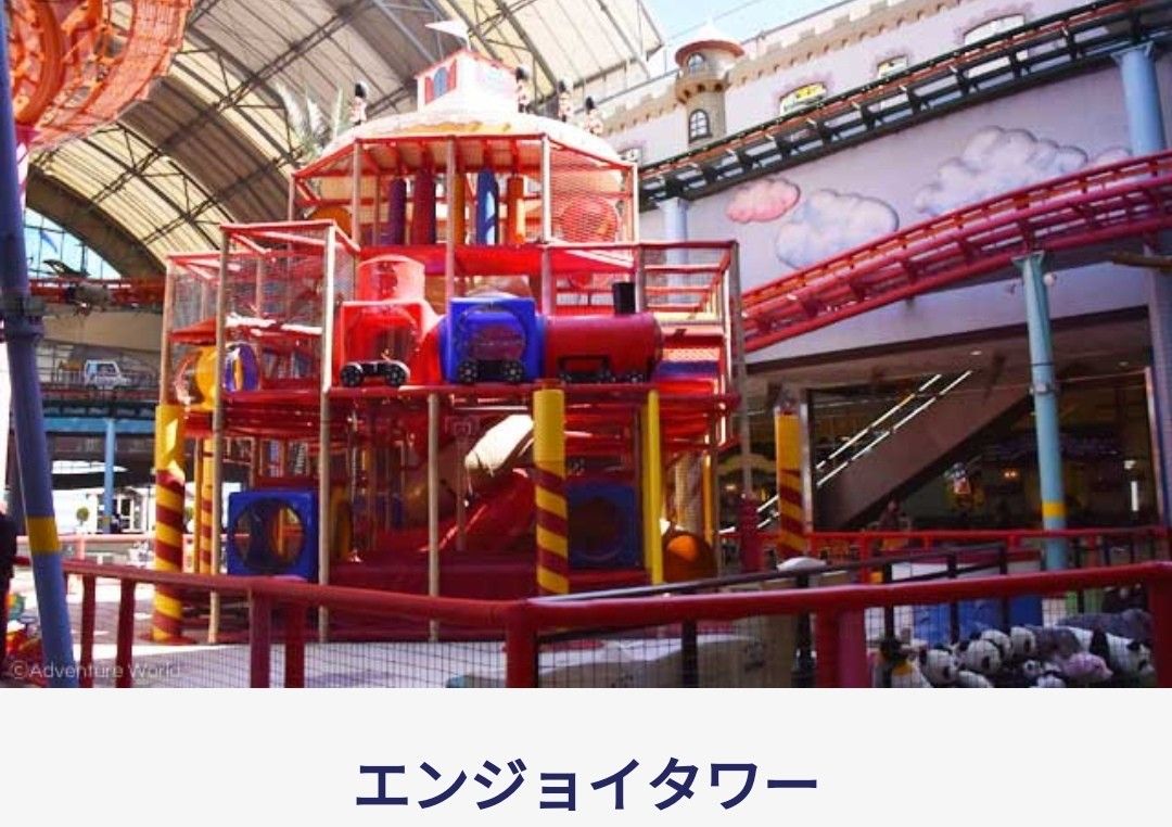 娘が遊園地の方へ行きたいと熱心に訴えて来るので、ここで休憩も兼ね、エンジョイドームへ。「座りたいー」と言っていた娘、すぐエンジョイタワーへ行きました。1人300円、15分の時間制限ありです。無料のスペースと勘違いしてました💦2,000円で乗り放題なんですが、それだと動物を全く見れなくなってしまうので厳選して上のエンジョイタワーとこの2つをやりました。リトルアドベンチャーは娘と夫、2人だけ。スカイシップは途中で「こんなとこお客さんに見せていいの?!」と思うくらいビミョーな所を通過します。屋根の上みたいな…何だか夢が壊れるなーと思っちゃいました。その後エンジョイドーム内でお昼を食べ、その間に買い物へ2回に分けて行きました。まずは私だけ。ゆっくり商品を見るため。アドベンチャーワールドは規模が大きいのでお菓子もオリジナルのものが多くて楽しかったです。私の買い物が済んだ後、子どもたちも一緒に連れて行き、欲しいものを選ばせました。ずーっとトラのぬいぐるみを欲しがっていた息子。レジ近くでプラレールを発見して、即ぬいぐるみを返しに行きました。子どもたちを呼びに行く前から予想はしていたのですが、本当にその通りになりました。ネットで買えば安いのに…と思いましたが、今ここで買ってあげることに意味があると思って息子にはプラレールを、娘にはスタンプとノートを買いました。食事休憩と買い物が済んだ後、海獣館へ。海獣館での目的は息子が見たがっていたペンギンとこれ。動物に息子ほど興味のない娘。運良く一番前で見ることができ、釘付けになっていました。私も一番前で見たかったー💦一番前で見てこそ迫力があると思うので、「絶対見たい!」という方は少なくとも20分くらい前にいた方がいいかなーと思います。平日で混んでない日だともっと見やすいのかな。海獣館を後にし、次はアニマルアクションへ。色んな動物を見ることができて、とても充実したショーでした。私的には夜のイルカショーよりも楽しかったかも…子どもも夢中になって見ていました。お客さん参加型でびっくりしましたが、それも人気の理由の1つかもしれないですね。たくさんの動物を一気に見れるので、これだけでけっこう満足できます。ひとつ残念だったのはアシカとの写真撮影が天候の関係で中止になったこと。写真撮影が2回目の公演後のみだったので、2回目の公演を見たのですが、それなら1回目の公演で見ておけば良かったー💦