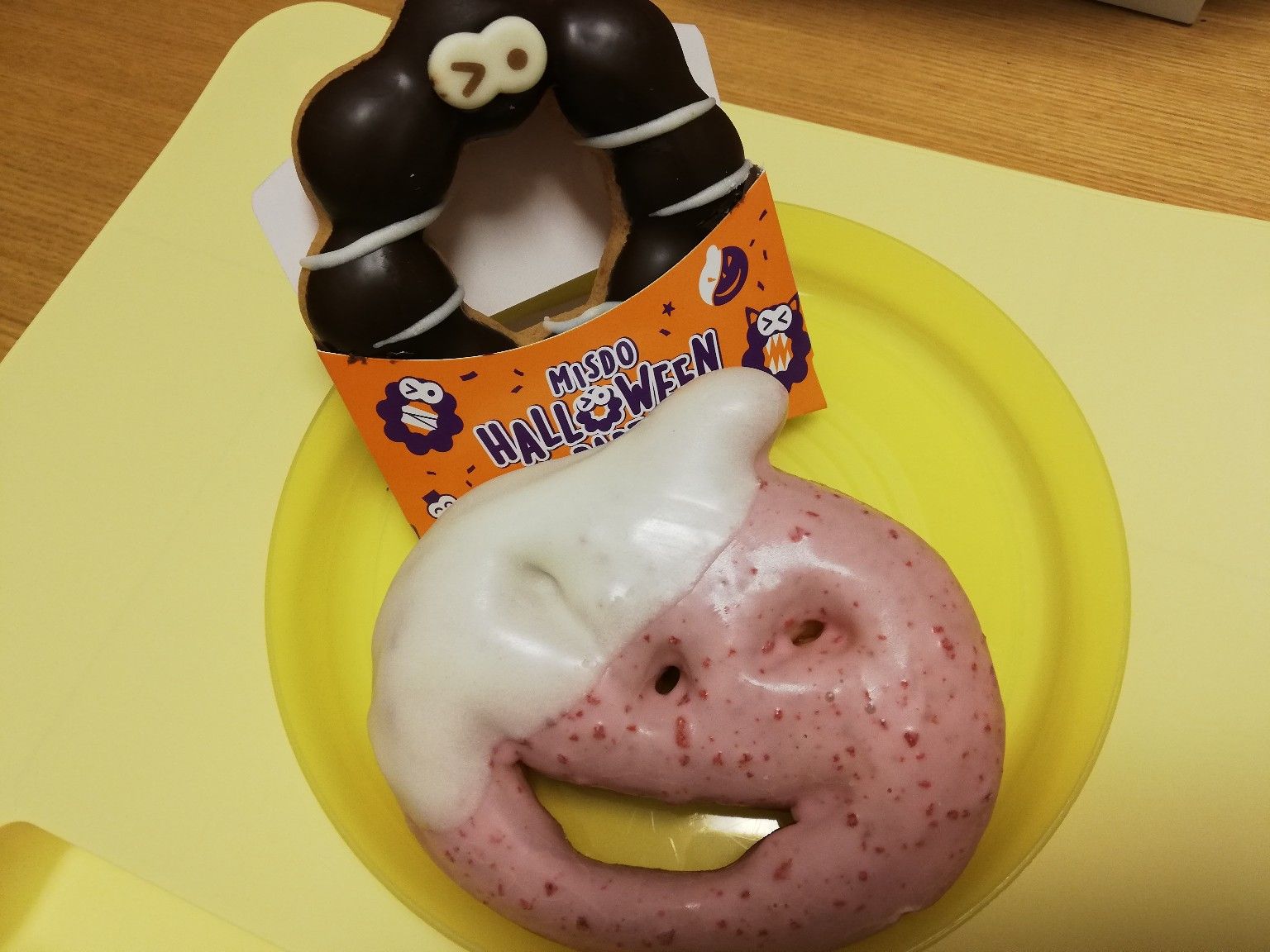 昨日イオンへ行ったときにミスドにあったハロウィーン仕様のドーナツが目に入り… 子どもたちが喜ぶかなー✨と 久しぶりに買ってみました! 娘が選んだドーナツ。 食べたのが夕方の遅い時間だったので、もちろん夜ご飯食べられず💦 娘は喜んで食べていました。 息子が選んだドーナツ。 ほとんど残しました💦 パパに帰宅後食べてもらいました。 私は残りを。 オールドファッションベースのはまあまあでしたが、もうひとつのはチョコがおいしくない? とりあえずこんなの2つも食べたら胃もたれするに決まってますね…😣 とりあえずトッピングがポロポロ落ちるし、子どもは手にチョコがつくのが嫌でフォークを使って食べようとするけど、そうするとドーナツがボロボロ… かわいくてつい買ってしまいましたが、ドーナツと言えどけっこうな値段だし今度からはフツーにケーキとかにしようと思いました💦