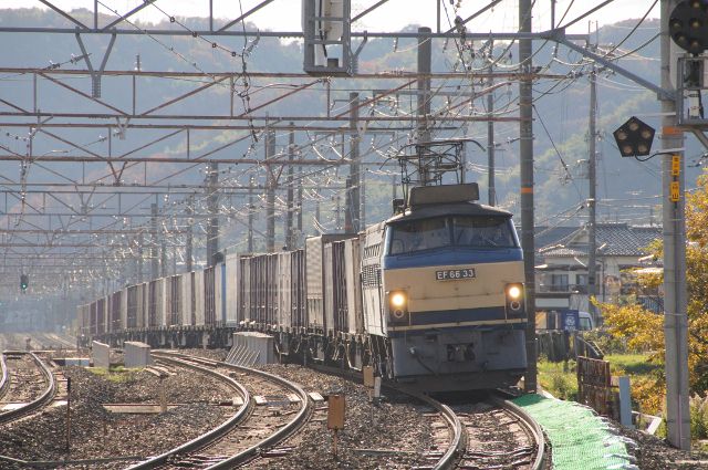 2011.12.13(火)最近めっきり減ってしまったEF66の0番台ですが、前日に2081レ(所定EF210吹田)に代走で入っていたので、翌日の5070レ(所定EF210吹田)を狙うことにしました。2011.12.13 5070レ EF66-33+コキ 東海道本線 島本-山崎Nikon D300+AF-S NIKKOR 18-200mm F3.5-5.6 VR,200mm,ISO400,1/500秒,f9,WBオート加島付近で2時間待つより山崎付近に移動して他の列車を撮りながら待つことにしました。2011.12.13 5070レ EF66-33+コキ 東海道本線 島本-山崎Nikon D300+AF-S NIKKOR 18-200mm F3.5-5.6 VR,200mm,ISO400,1/500秒,f9,WBオート2011.12.13 5070レ EF66-33+コキ 東海道本線 島本-山崎Nikon D300+AF-S NIKKOR 18-200mm F3.5-5.6 VR,90mm,ISO400,1/500秒,f9,WBオートこの場所は200mmでは少し短いですね、どうもレンズ交換が… 2011.12.13 東海道本線 島本-山崎↓↓↓↓↓ 「にほんブログ村」のブログランキングに参加してます、下のバナーをクリックしていただけると幸いです、応援よろしくお願い致します。にほんブログ村にほんブログ村にほんブログ村