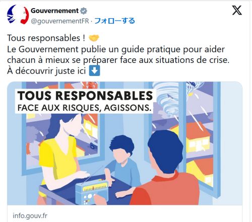 【フランス】【Tous responsables】フランス政府がサバイバルガイドun guide pour mieux faire face aux risquesという27ページのオンラインマニュアルを公開