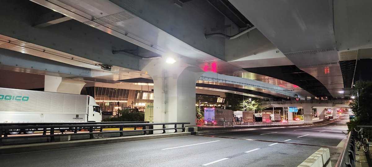 向こうの車線の、後部が水色のトラックは、有明アリーナの建物の下から出てきたところ。