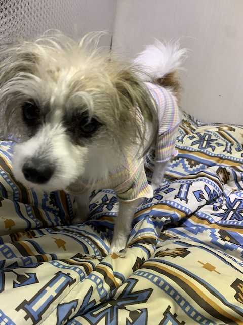 逃げてたんだけど、パジャマ着せられちゃった。こういう感じ。毛が抜けないようにだって…
