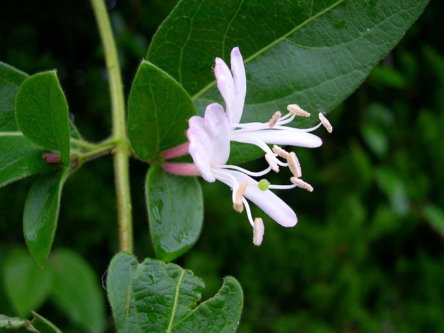 ★スイカズラ 千本松地区でスイカズラが咲いていました。スイカズラはスイカズラ科の植物で北海道、本州、四国、九州に分布します。山野や道ばたに生えるツル性の植物です。花は長さ3~4.5cmの筒形でです。はじめ白色ですが、のちに黄色になります。液果は径5~6mmの球形で、黒く熟します。葉や茎、花は薬用や染料にします。開花時期は5~6月です。和名は吸葛(すいかずら)で、管状になった花を引き抜き、管の細いほうを口に含んで静かに吸うと、良い香りがあって、花の蜜は甘い味がすることに由来します。 別名はキンギンカで、はじめ白色の花がだんだんと黄色になり、黄色と白色の花が混じって咲くように見えることに由来します。